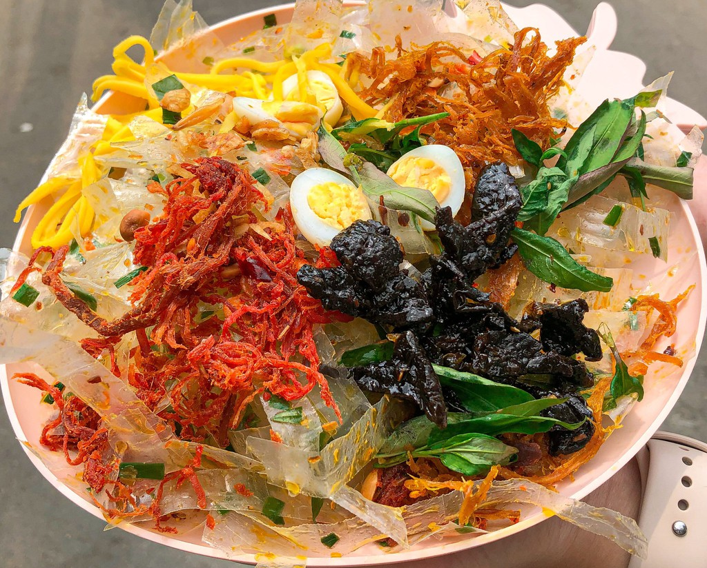 Bánh tráng khô bò tóp mỡ Hoàng Phúc gây mê với lớp bánh tráng dẻo dai, khô bò cay nhẹ cùng xoài xanh chua ngọt, trứng cút béo bùi, rau răm thơm và tóp mỡ giòn rụm. Cay nhẹ, ăn hoài không ngán.